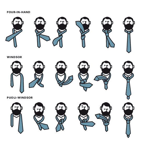 Alla olevassa taulukossa opetetaan myös kaksi muuta solmua. Four-in-handin voima on siinä, että se on helppo, ei liian pieni eikä liian suuri. Se sopii suurimpaan osaan kauluspaidoista. Muista, että solmusta tulee joka kerta vähän erilainen. (Älä myöskään ole mies, joka tekee solmun kerran ja käyttää aina samaa solmittua kravattia).